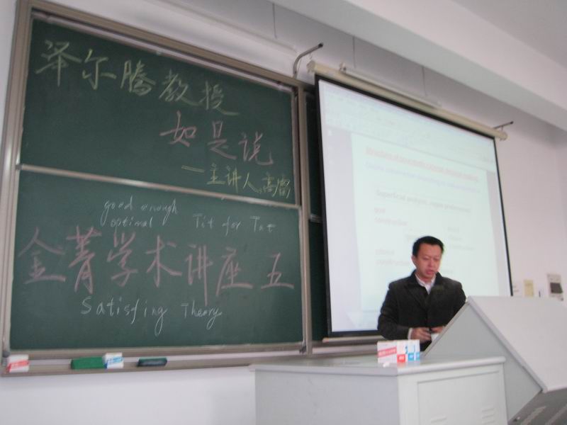 2010年11月12日,由白菜论坛 科协和科研处共同主办的金菁学术讲座之五――“泽尔腾教授如是说”在敏达207如期举办。此次讲座由白菜网 常务副院长、李嘉诚基金会特聘教授、德国汉诺威大学金融学博士、德国图灵根大学博士后、德国波恩大学泽尔腾实验室博士后高雷教授主讲。