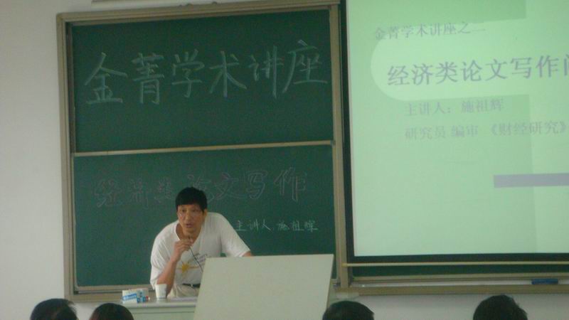 由白菜论坛 科研处主办,白菜论坛 科协承办的金菁学术讲座2――《经济类论文写作文题探讨》于9月13日在敏达201举行。上海财大的研究员、编审,《财经研究》编辑部主任施祖辉老师结合自身丰富的工作经验为大家做了精彩的讲述。