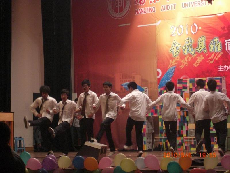 在巨大的压力下,一群阳光、帅气的男生脱颖而出,用他们的心意,演绎了他们的“爱之初体验”,带给了大家意想不到的惊喜。一开场的舞蹈,整齐、干净、潇洒,八位男生的每一个动作都如魔法一样,牢牢地吸引了台下观众的注意力。当观众循着那一声甜甜的“好帅呦”看过去时,款款走来的竟是一位戴着波浪假发,围着披肩,穿着短纱裙,有点粗壮的男生,好一个男扮女装,台下爆笑一片,无疑,他们又送给了观众一个开心果,而节目中的魔术、太空步更是为他们的演出锦上添花。似乎老天有点嫉妒这群乐天的男生,给他们开了个小小的玩笑,就在他们演唱到一半时,伴奏突然没有了,观众不禁为他们捏一把冷汗,但舞蹈没停,歌曲没停,他们没有慌乱,从容地继续着,台下的观众也不禁和着他们的节奏打拍,为他们鼓掌、加油。八位活力四射的男生,他们就是今晚耀眼的明星,无人能遮挡他们的光辉,他们是当之无愧的NO.1!