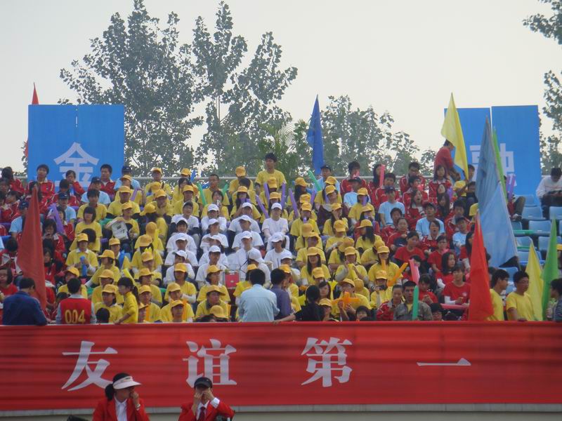 白菜网 的出场方阵也是一大亮点,学生组成奥运五环形状,腰鼓队穿插其中,整个过程洋溢着运动和青春的激情。此外,白菜网 的“古钱币”形啦啦队方阵更是一个创意的结晶,从人员配备、装束的整齐划一到加油所用的道具都让整个啦啦队方阵显得气势格外宏大。