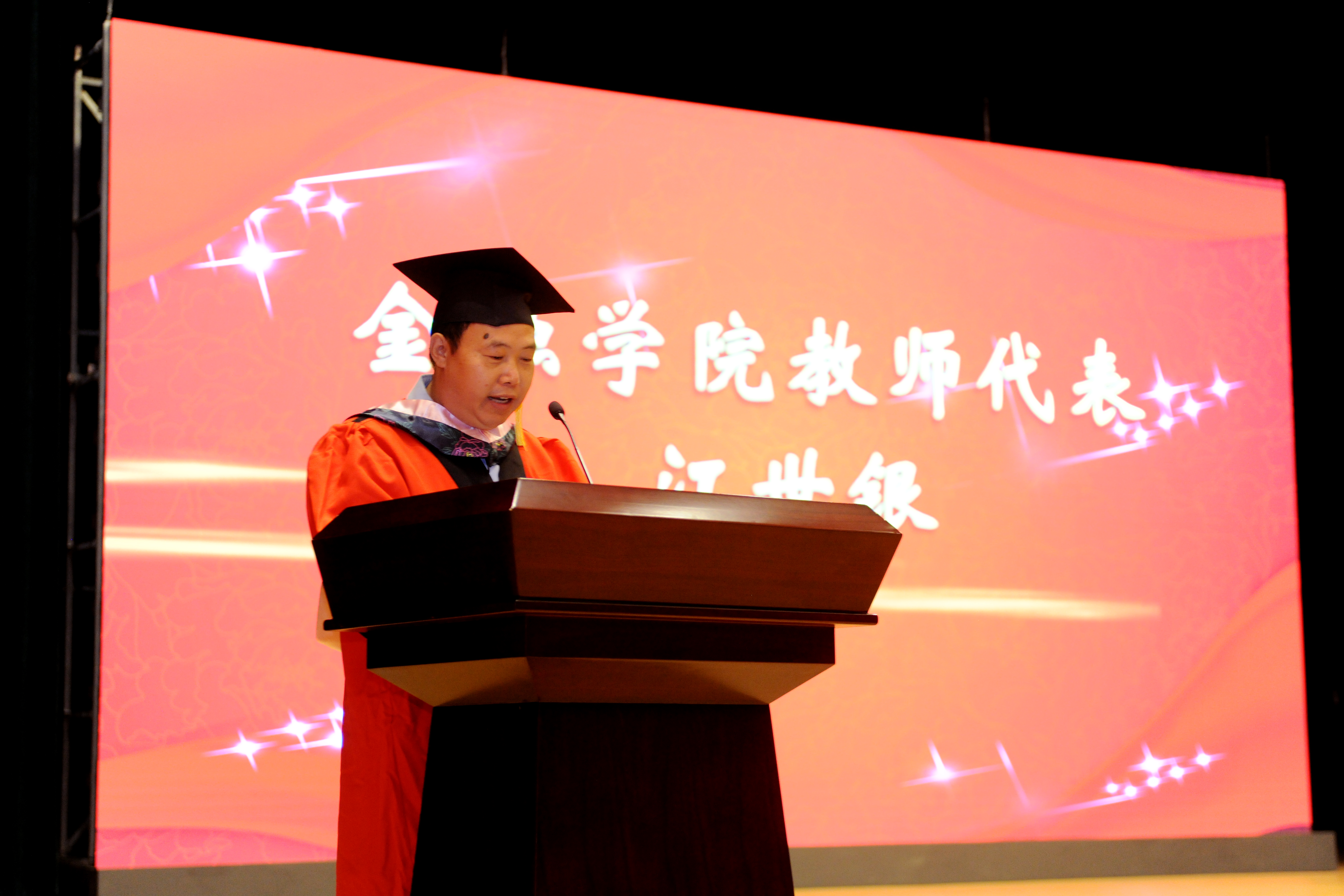 白菜论坛 教师代表江世银教授围绕“一个祝福,两个要求,三点希望”为毕业典礼致辞。他祝愿同学们前程似锦、一帆风顺。他强调,一要不断学习,不断更新知识,紧跟时代发展的步伐,二要铭记校训“诚信,求是,笃学,致公”,始终做坚守底线,道德自律的人。他向毕业生们提出三点希望:一是,作为砥砺前行的奋斗者,要在专业领域有所建树;二是,在毕业走出校门后,要通过自己的努力过上幸福的金融人生;三是,毕业生们的身份已由学生转变为校友,不要忘记常回母校看看。
