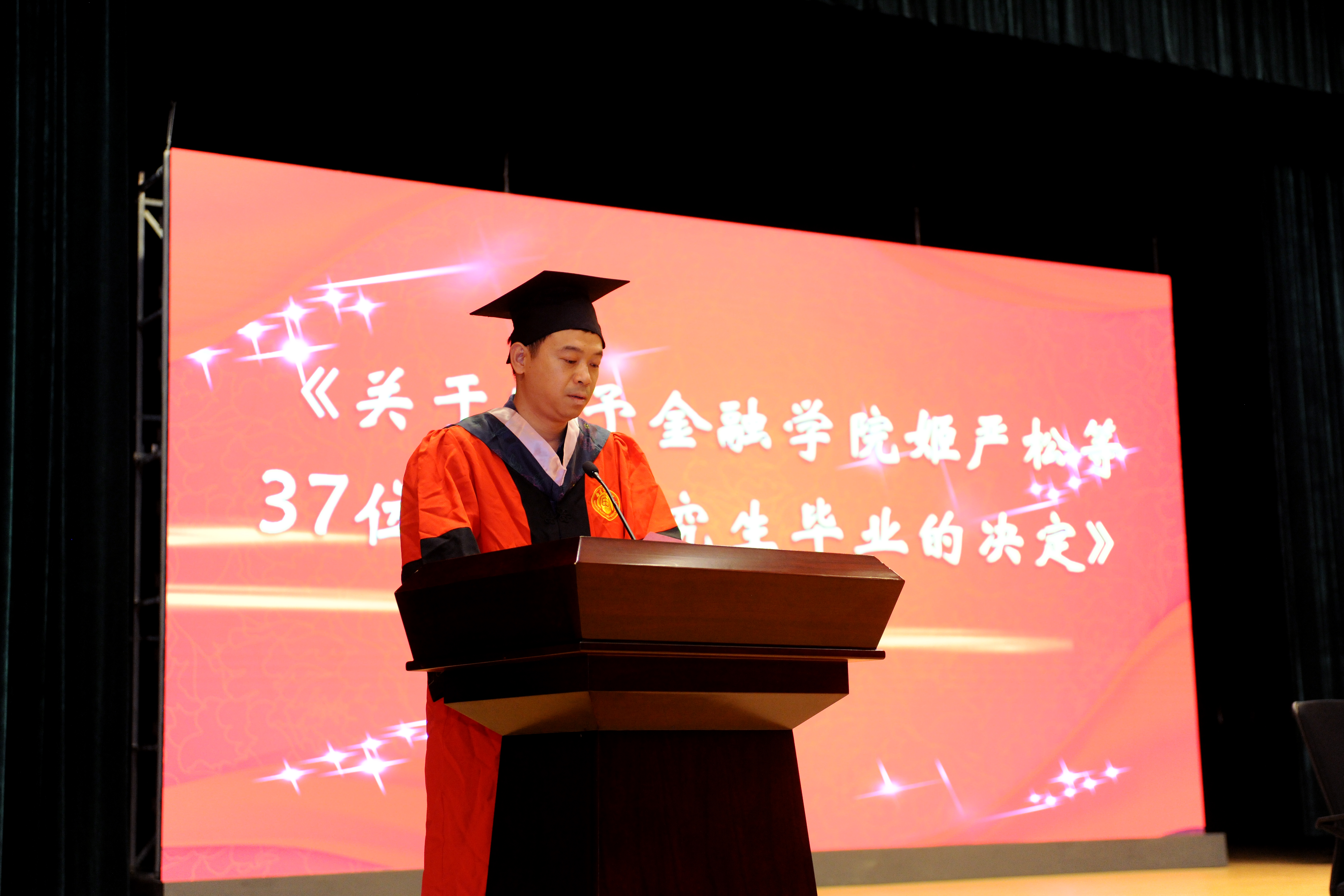 毕业典礼在庄严肃穆的国歌中拉开帷幕。白菜论坛 党委书记陆凯旋宣读《关于准予白菜论坛 杨芳芳等557位本科学生毕业的决定》及《关于同意授予白菜论坛 杨芳芳等555位普通本科毕业生学士学位的决定》。副院长刘骅宣读《关于准予白菜论坛 姬严松等37位硕士研究生毕业的决定》及《关于同意授予白菜论坛 姬严松等36位研究生硕士学位的决定》。