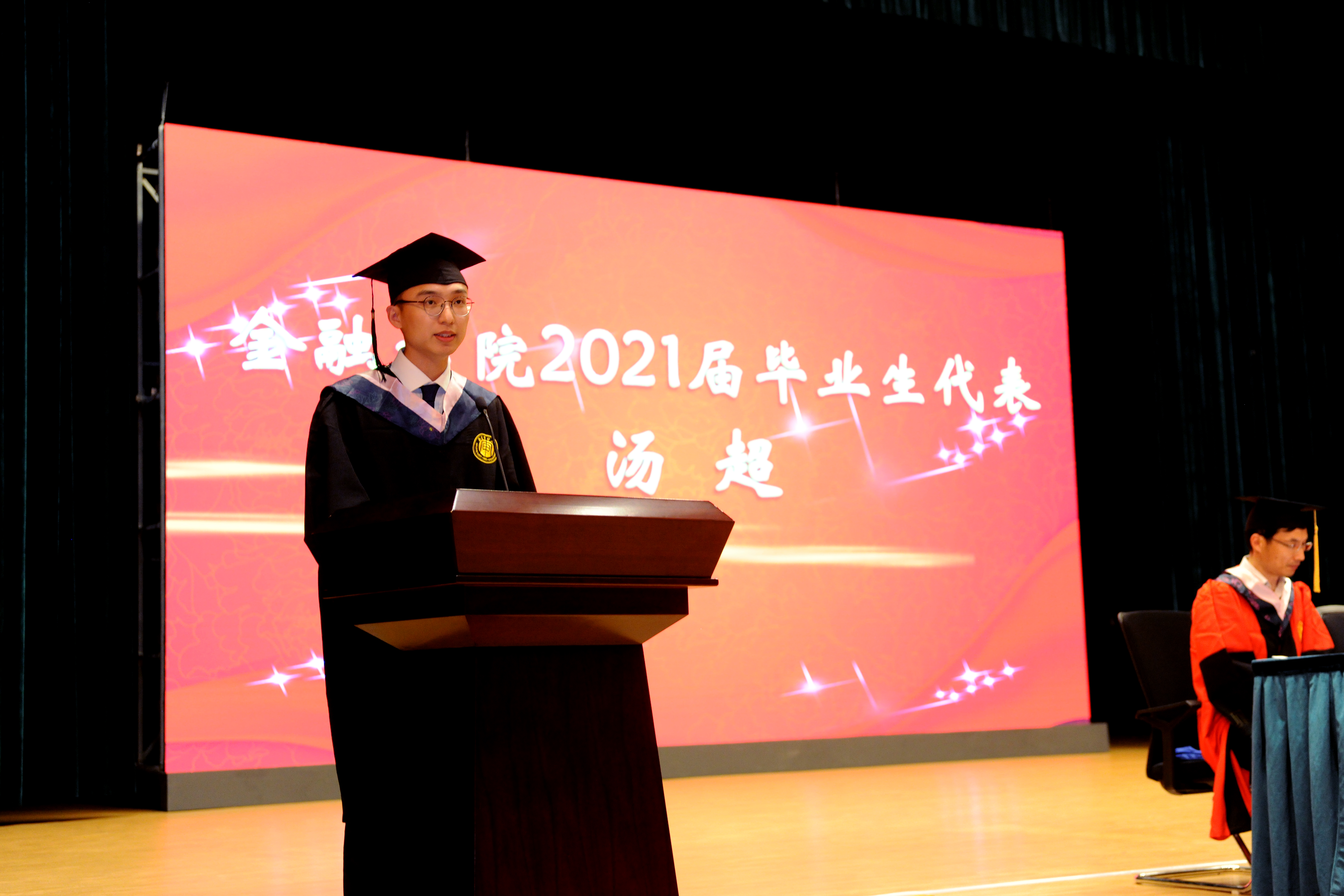 随后,来自2017级金融1班的汤超同学作为优秀毕业生代表发言。回顾四年校园生活,他百感交集。他形象地用“最后一次”和“第一次”赋予毕业特别的意义。他感激在润泽湖畔遇到每一位可爱可敬的老师,以及有趣温暖的同学。他骄傲的一句“我的母校是南审”充满了毕业生的激动与自豪。