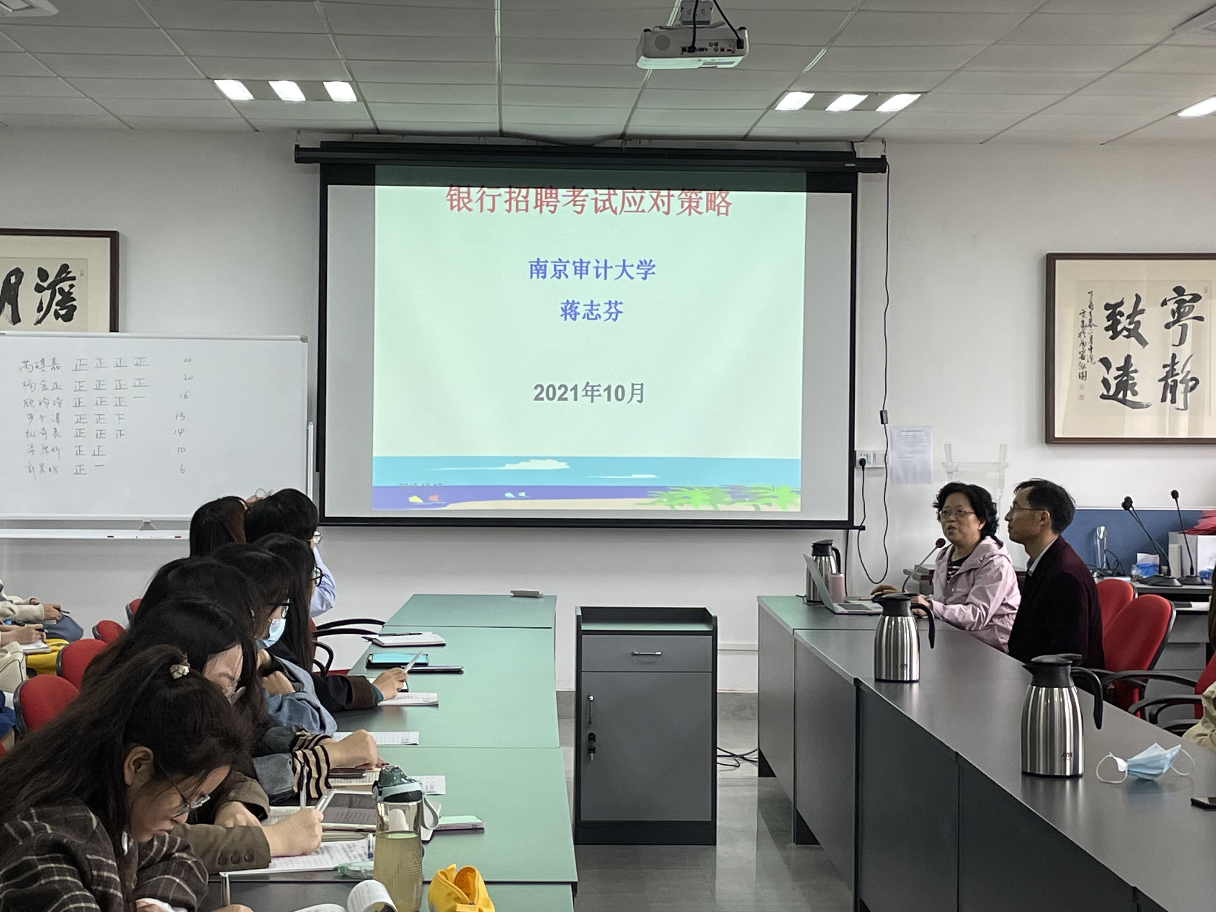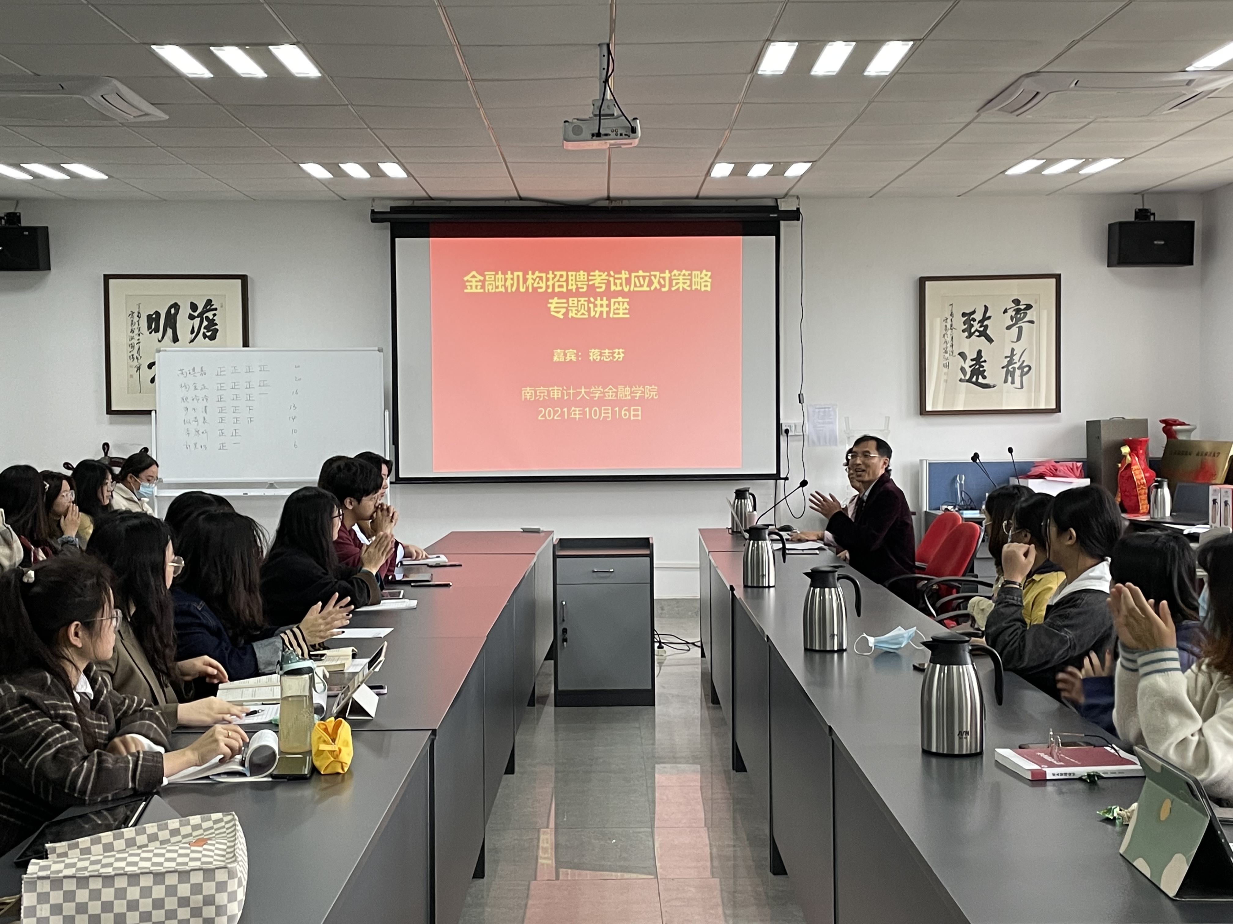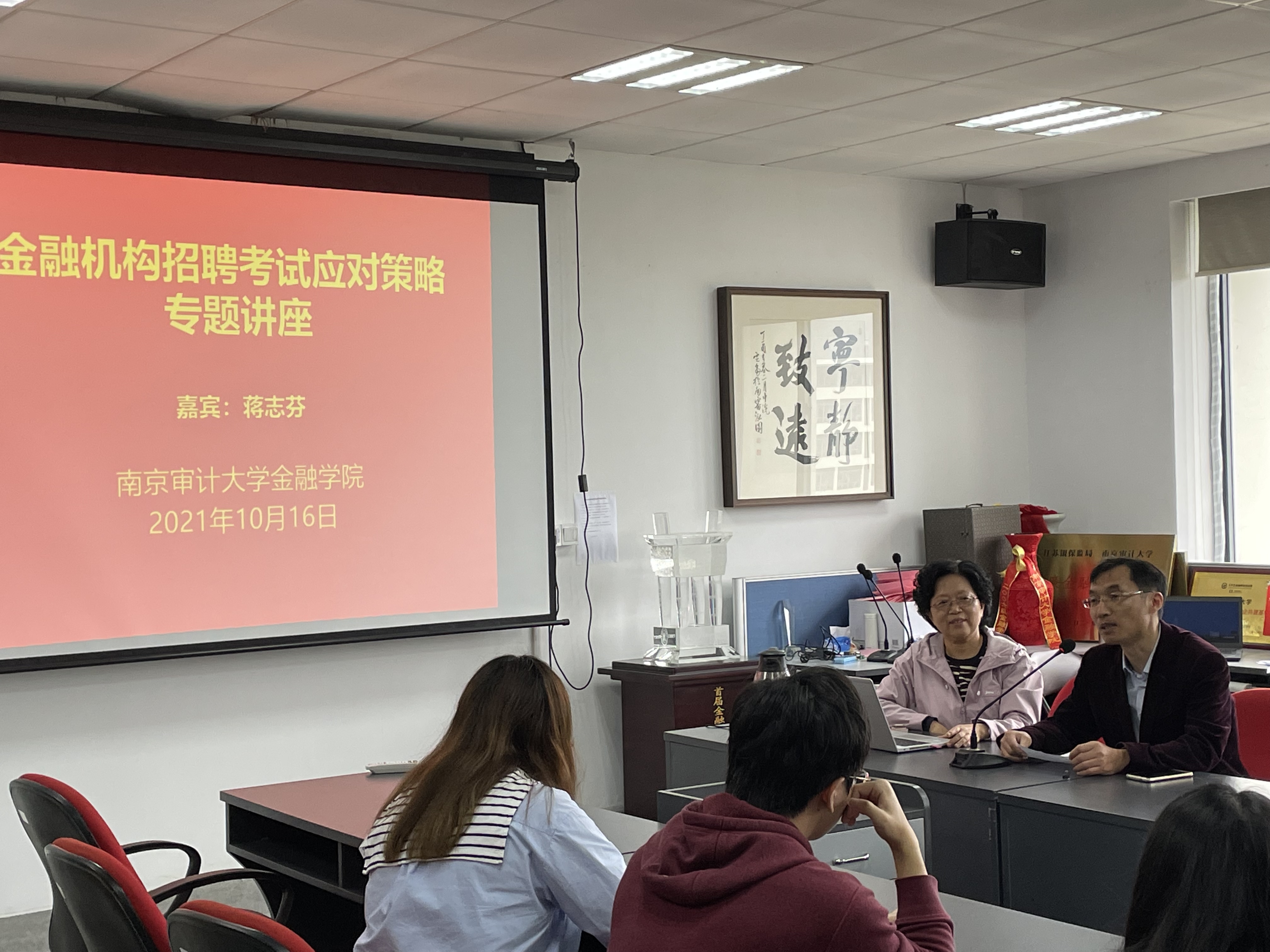 蒋志芬教授在讲座中介绍了银行招聘的相关流程及招聘要求,讲解了应聘简历的制作、网申技巧、笔试备考要点、面试基本礼仪,以及面试脱颖而出的技巧等。在指导笔试环节,蒋教授建议同学们要关注时政热点,了解政府出台的重大政策,夯实专业知识,丰富知识储备,熟悉报考单位的基本情况,研究各银行的出题风格。另外,蒋教授还介绍了近年来十几家商业银行的笔试题的部分内容。并且以去年南京银行、农业银行、建设银行面试题为例,介绍了无领导小组讨论、结构化和半结构化面试、正反方辩论等面试的关键要点,为学生求职提供了丰富的建议。最后,蒋教授向大家送出了衷心的祝福,祝福同学们如愿进入理想的工作岗位,收获幸福人生。