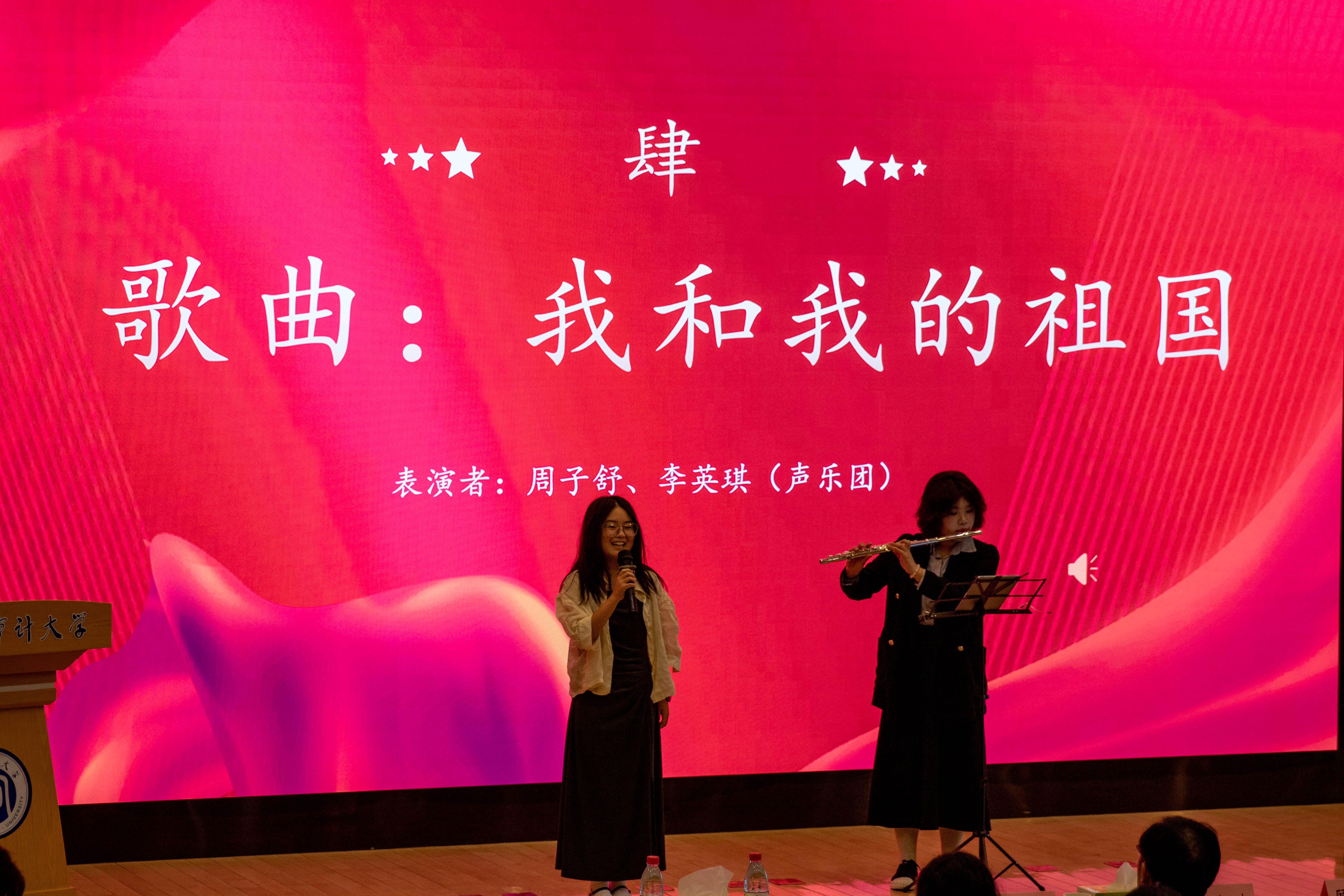 在紧张的比赛之余,由舞蹈团演出开场表演《红色之恋》,声乐团周子舒、李英琪同学慷慨激昂演唱《我和我的祖国》,草莓音乐协会周小迪同学带来了空灵悦耳的《追光者》,活动在声乐团刘春嘉同学高亢嘹亮的《歌唱祖国》中落下帷幕。