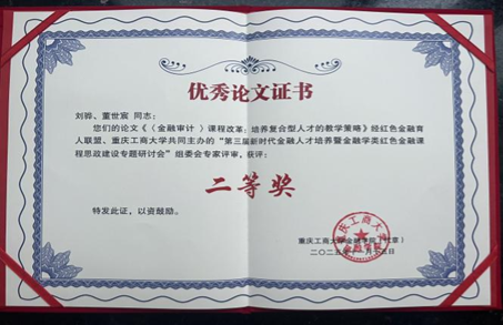 白菜论坛 副院长刘骅教授和研究生董世宸同学合作论文《<金融审计>课程改革:培养复合型人才的教学策略》荣获会议优秀论文二等奖。论文系统分析了白菜论坛 “金融审计”专业培养特色,《金融审计》课程建设现状、问题与改革路径,并为培养“金融+审计+计算机”复合型人才提供了教学策略,得到了与会专家的认可与好评。