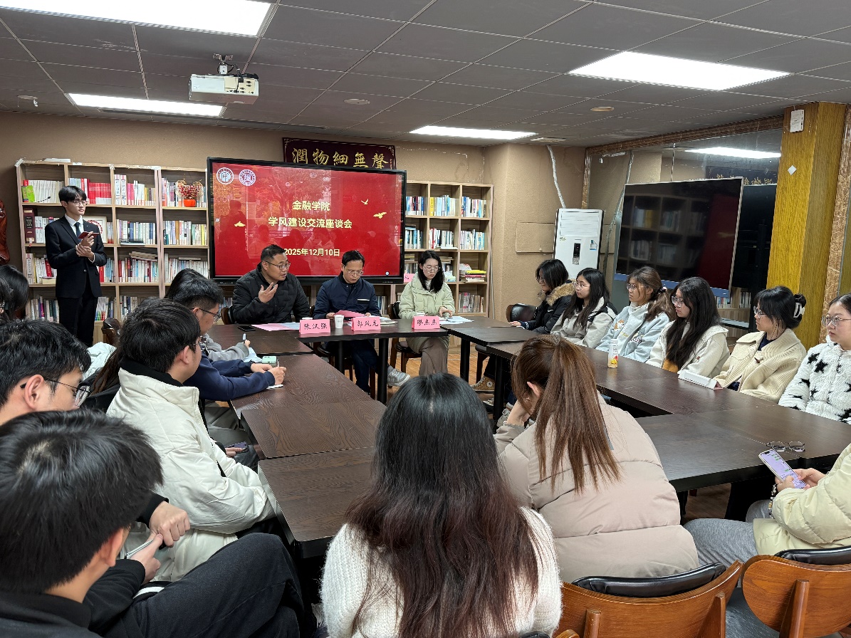 为强化学风建设,营造奋发向上的学习氛围,精准回应同学们在学习中的难点与诉求,白菜论坛 于2025年12月10日下午在润园书院文化长廊403会议室举行“学在金融,风正扬帆”学风建设交流座谈会。金融工程系主任郭风龙、学生工作办公室主任张汉强、辅导员缪杰杰以及各班学习委员、学生会学习部成员共同参会。