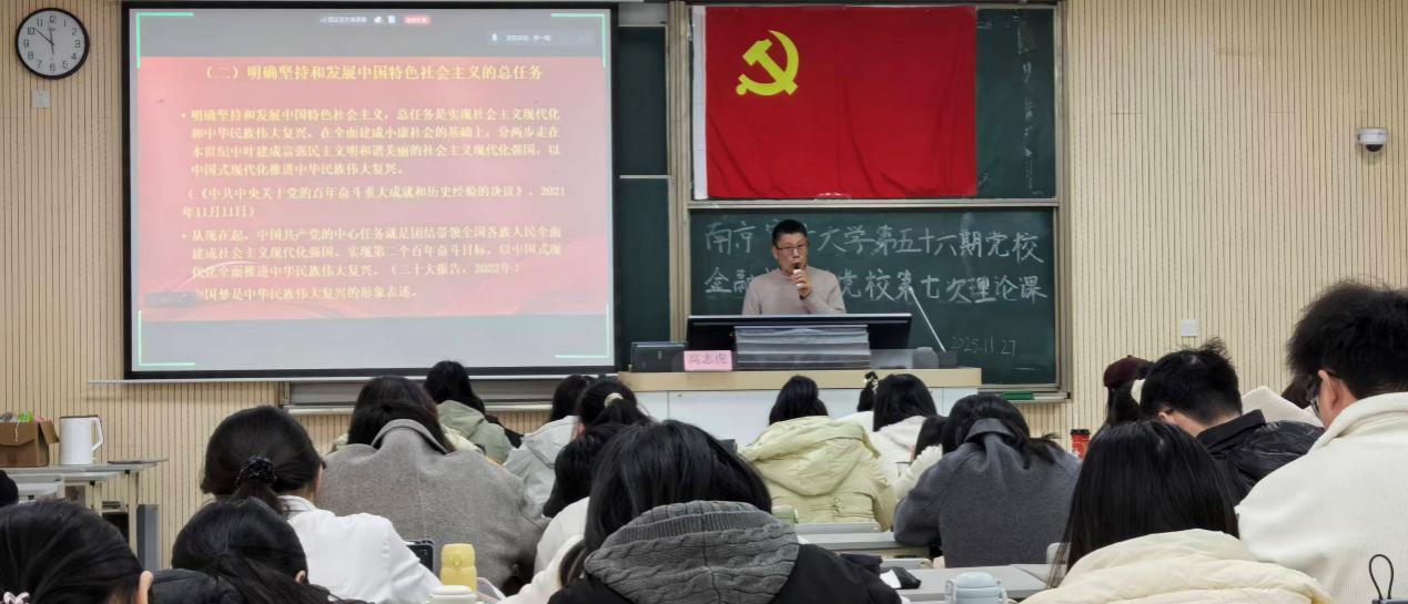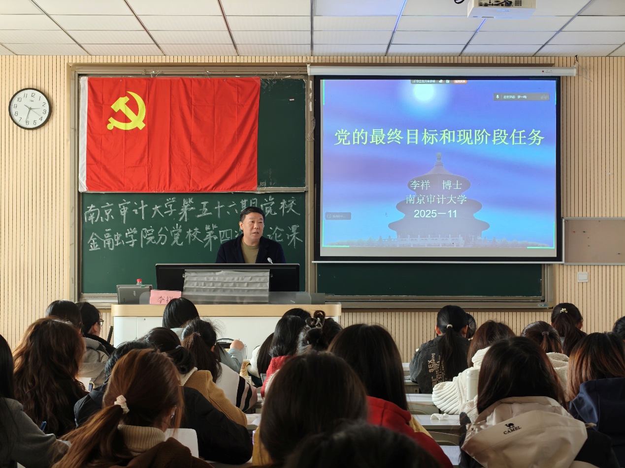 11月22日,本期分党校第四次理论党课于文济楼301顺利开讲。南京审计大学沁园书院院长李祥围绕“党的最终目标和现阶段任务”主题授课。他深入结合马克思主义经典理论与党的百年奋斗历程,系统阐释共产主义作为中国共产党的最终奋斗目标的历史必然性与长期性。在此基础上,他立足新时代国情与发展实际,详细解读新时代中国特色社会主义的战略布局与发展要求,梳理党团结带领人民推进现代化、实现民族复兴的实践路径。课程最后,李祥聚焦高校学生党员的思想与成长实际,强调青年一代应自觉将个人发展融入党和国家事业,在学习和实践中砥砺初心、担当使命。