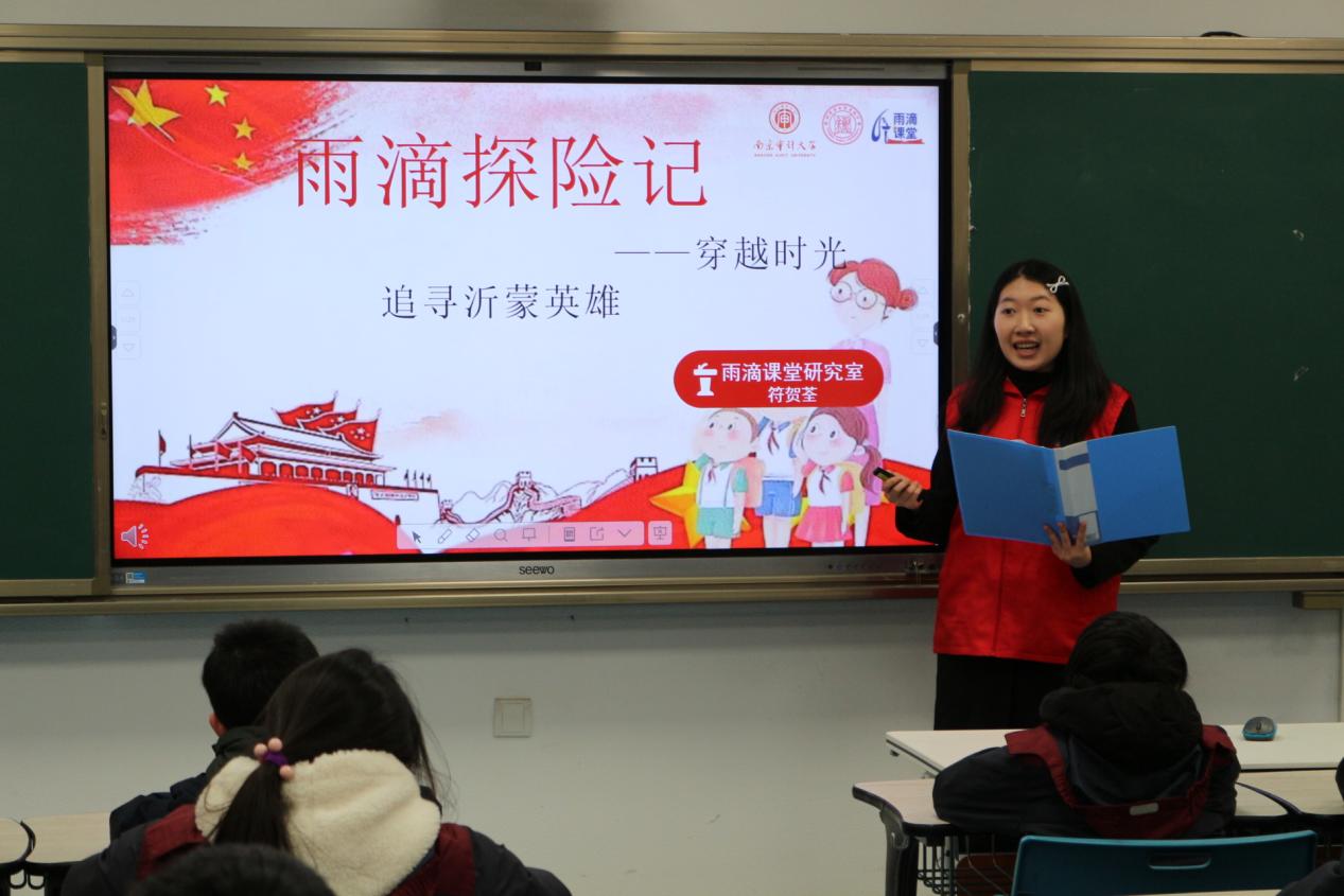 紧接着,白菜论坛 “雨滴课堂”研究室主讲人符贺荃同学走上讲台,以同辈人特有的亲和力与创造力,带领孩子们开启了雨滴探险记——一场穿越时空的“沂蒙精神”探寻之旅。