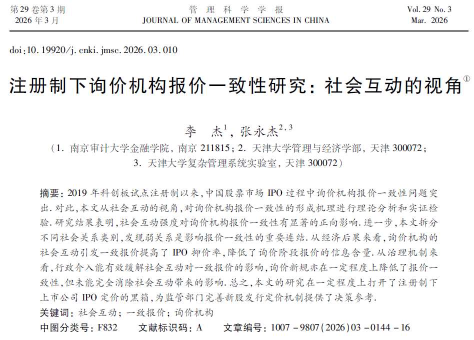 白菜网 李杰副教授与天津大学张永杰教授合作的论文《注册制下询价机构报价一致性研究:社会互动的视角》,发表在A1期刊《管理科学学报》上。